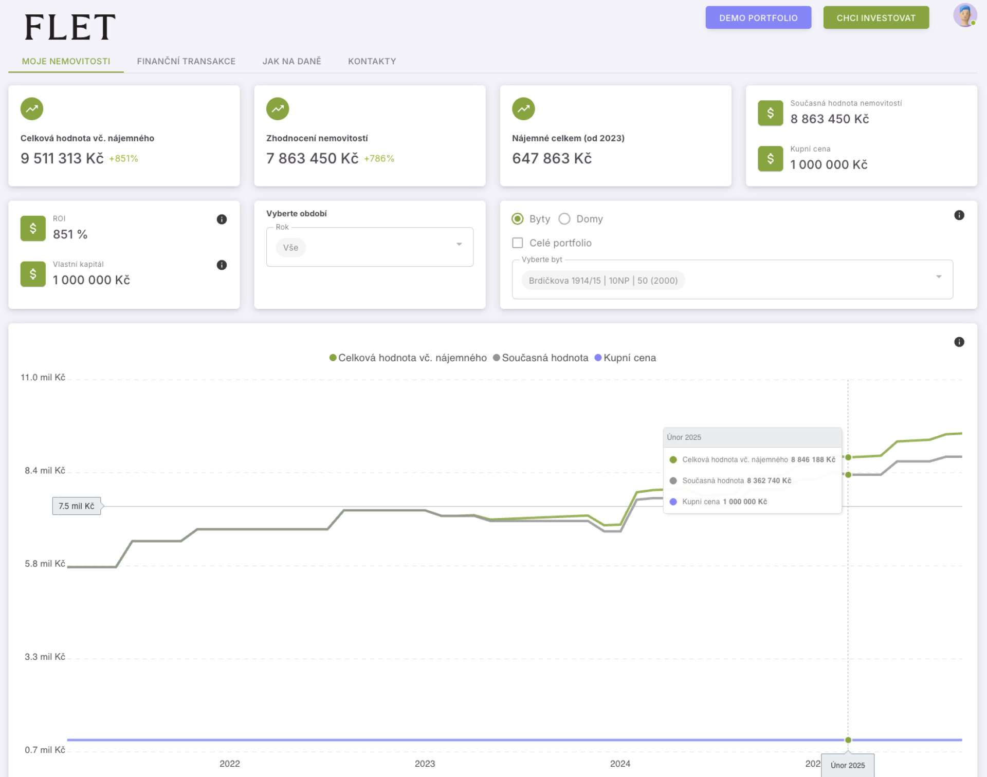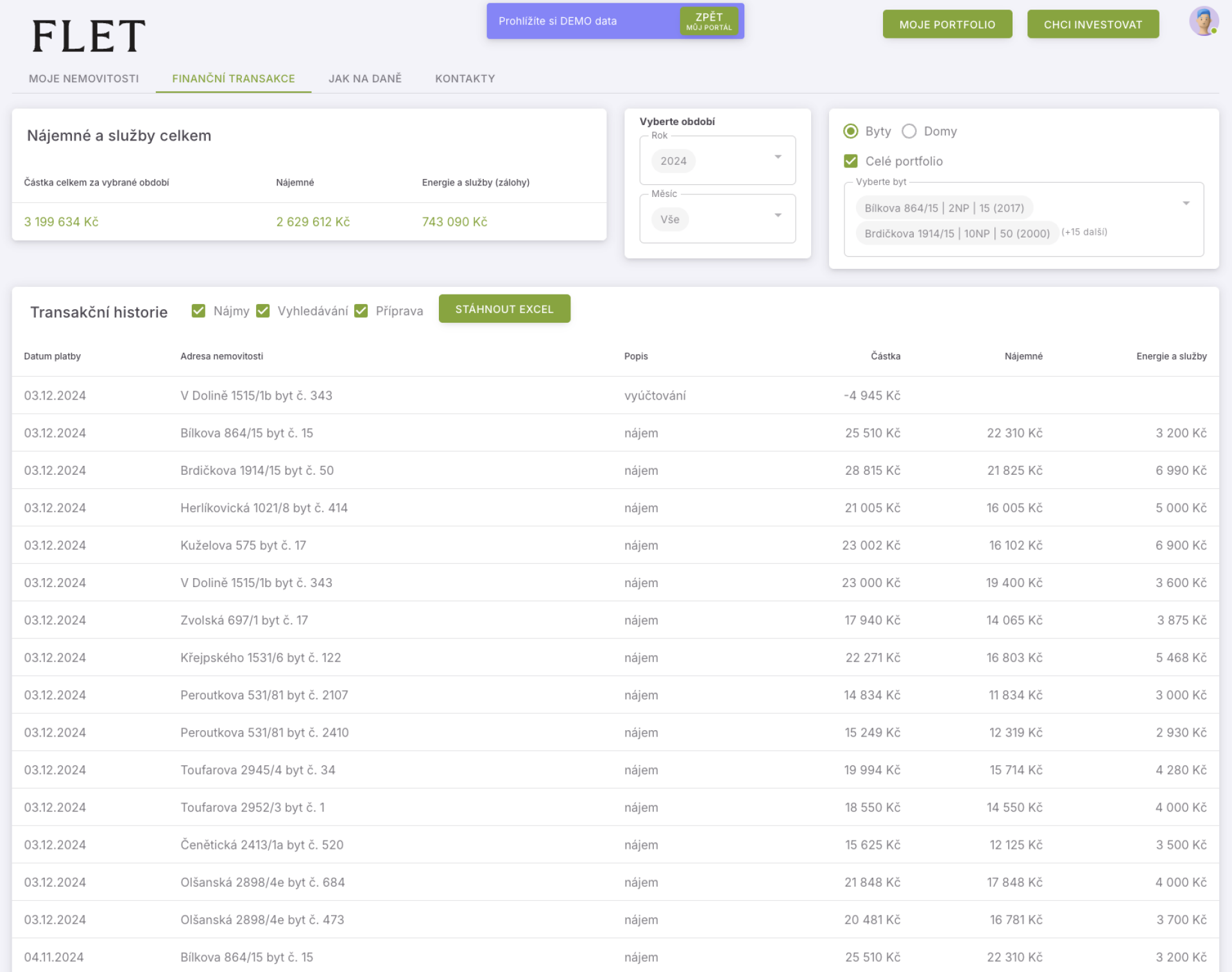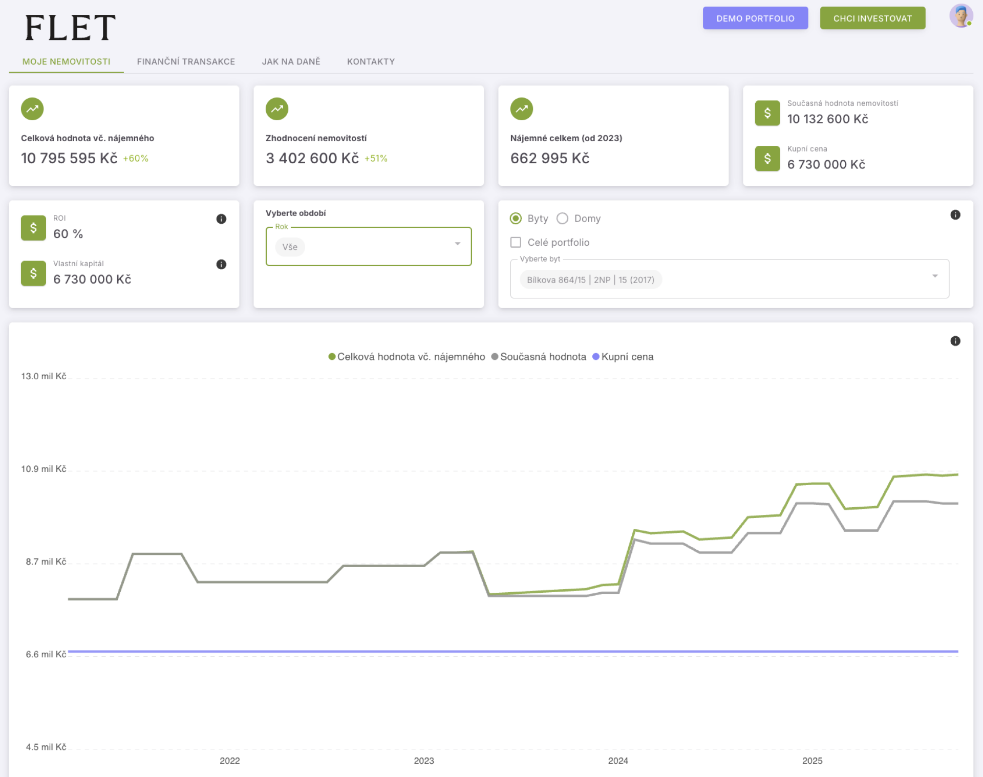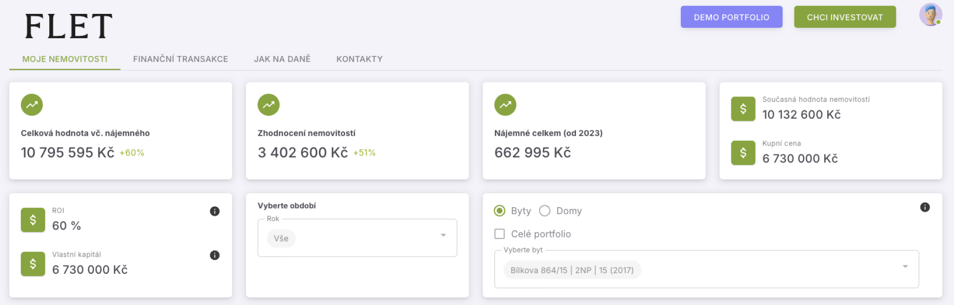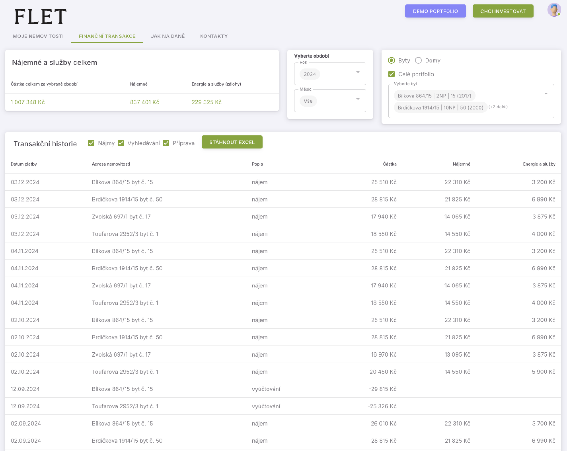 Data je možné filtrovat po letech a také podle nemovitostí: můžete si zobrazit celé portfolio, jednotlivý byt nebo si vybrat skupinu nemovitostí. Například byty ve stejné části Prahy nebo v jednom bytovém domě.