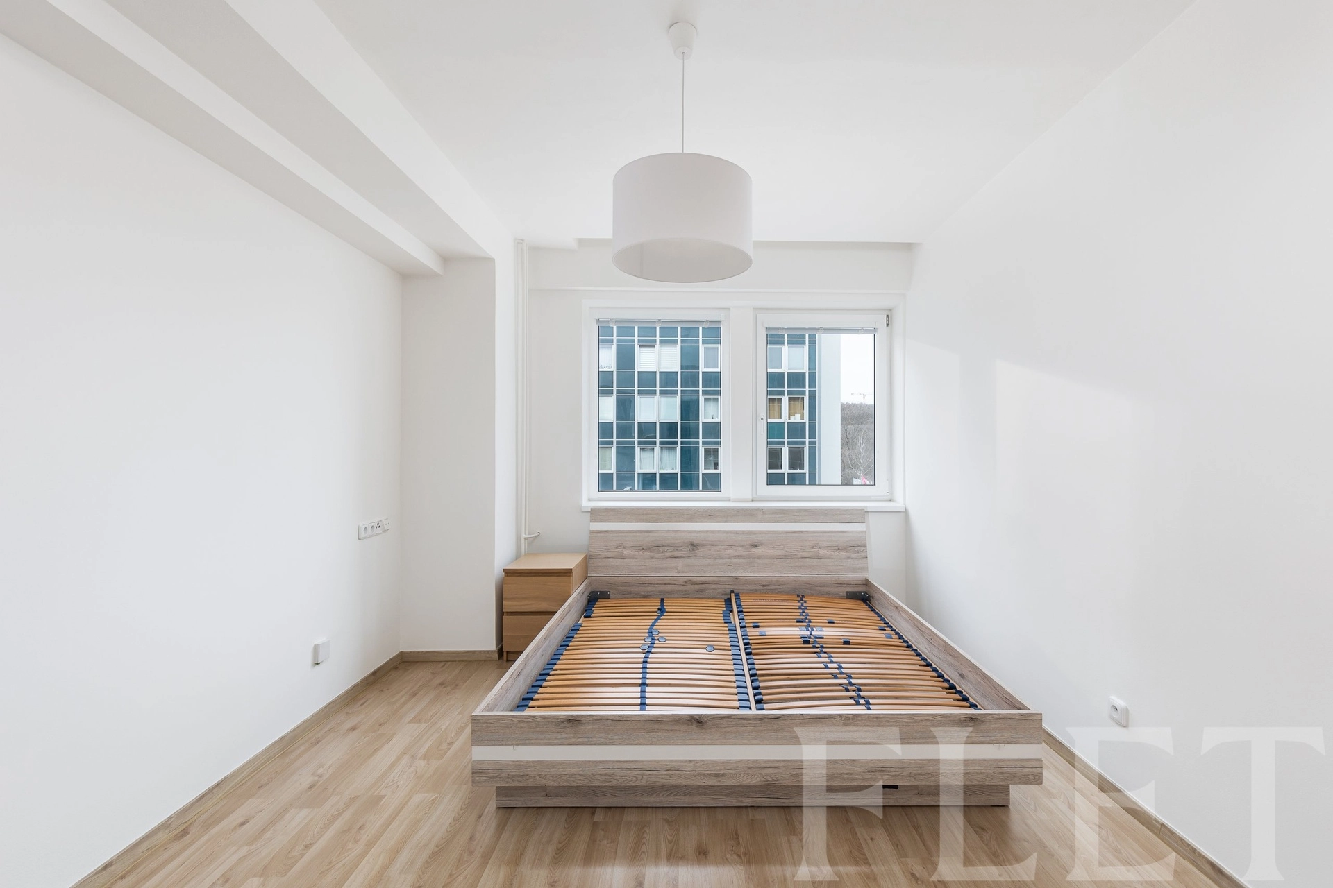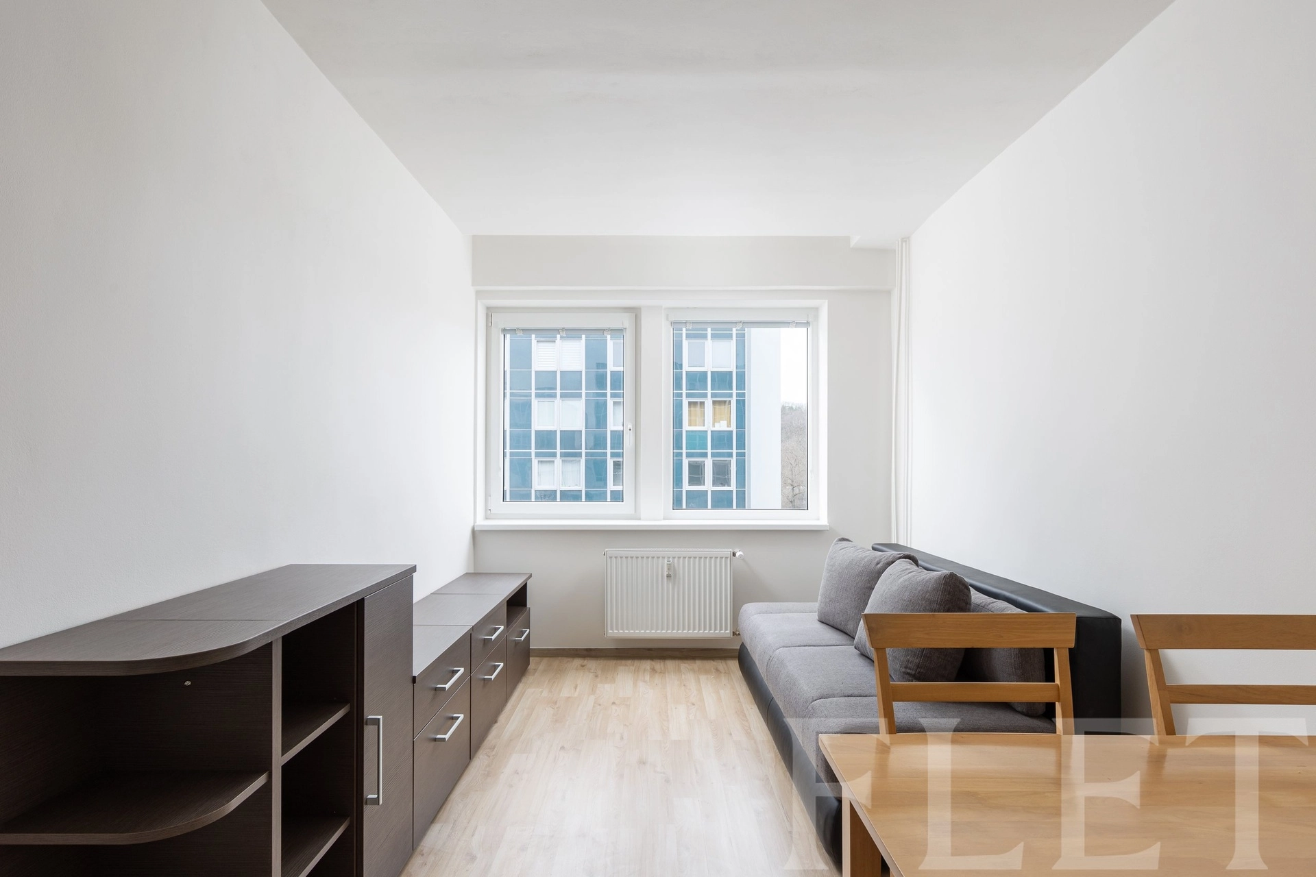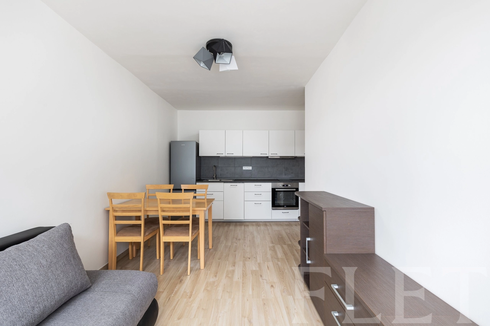 Dispozice bytu je velmi praktická a promyšlená. Ze vstupní chodby s vestavěnými skříněmi se dostanete do všech místností. Koupelna je vybavena sprchovým koutem a toaletou v moderním, nadčasovém standardu. Samostatná ložnice nabízí dostatek prostoru pro plnohodnotnou postel i úložné řešení. Hlavní obytná část je tvořena světlým obývacím pokojem propojeným s kuchyňským koutem a jídelním prostorem. Kuchyňská linka je v čistém designu, doplněná o vestavěnou troubu, varnou desku, myčku, digestoř i lednici. Velká okna zajišťují dostatek denního světla a příjemnou atmosféru. Celkově byt působí velmi vzdušně, čistě a je připraven k okamžitému užívání.