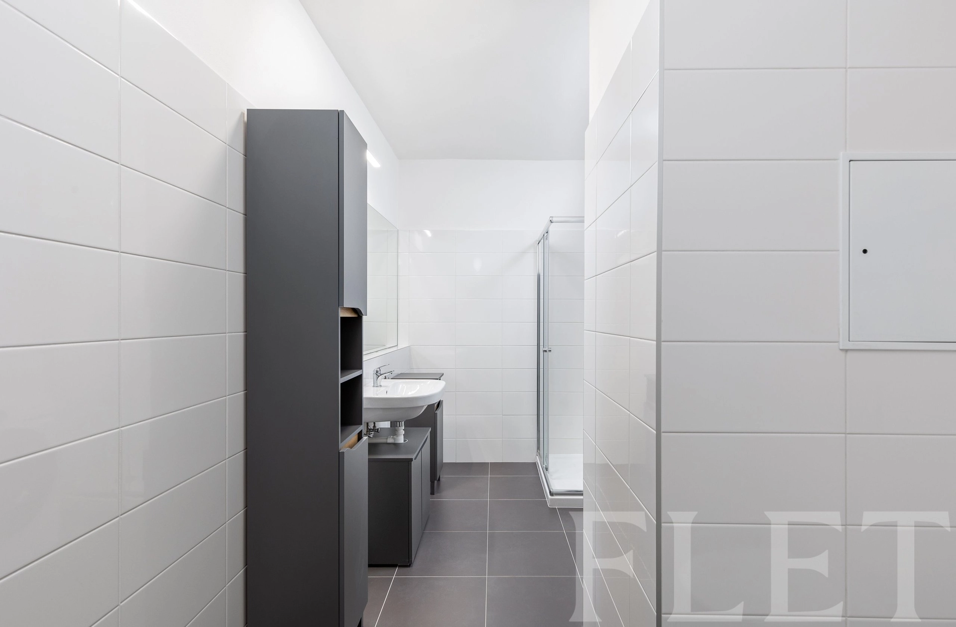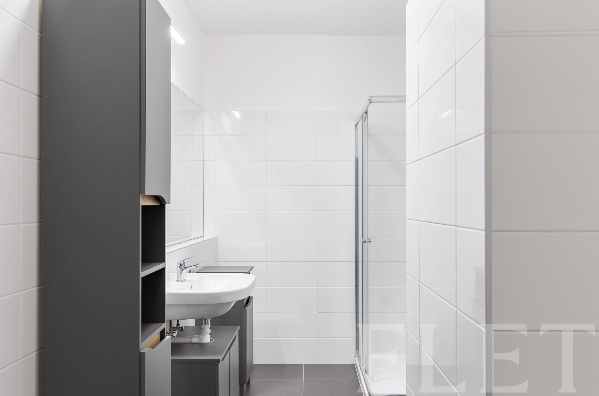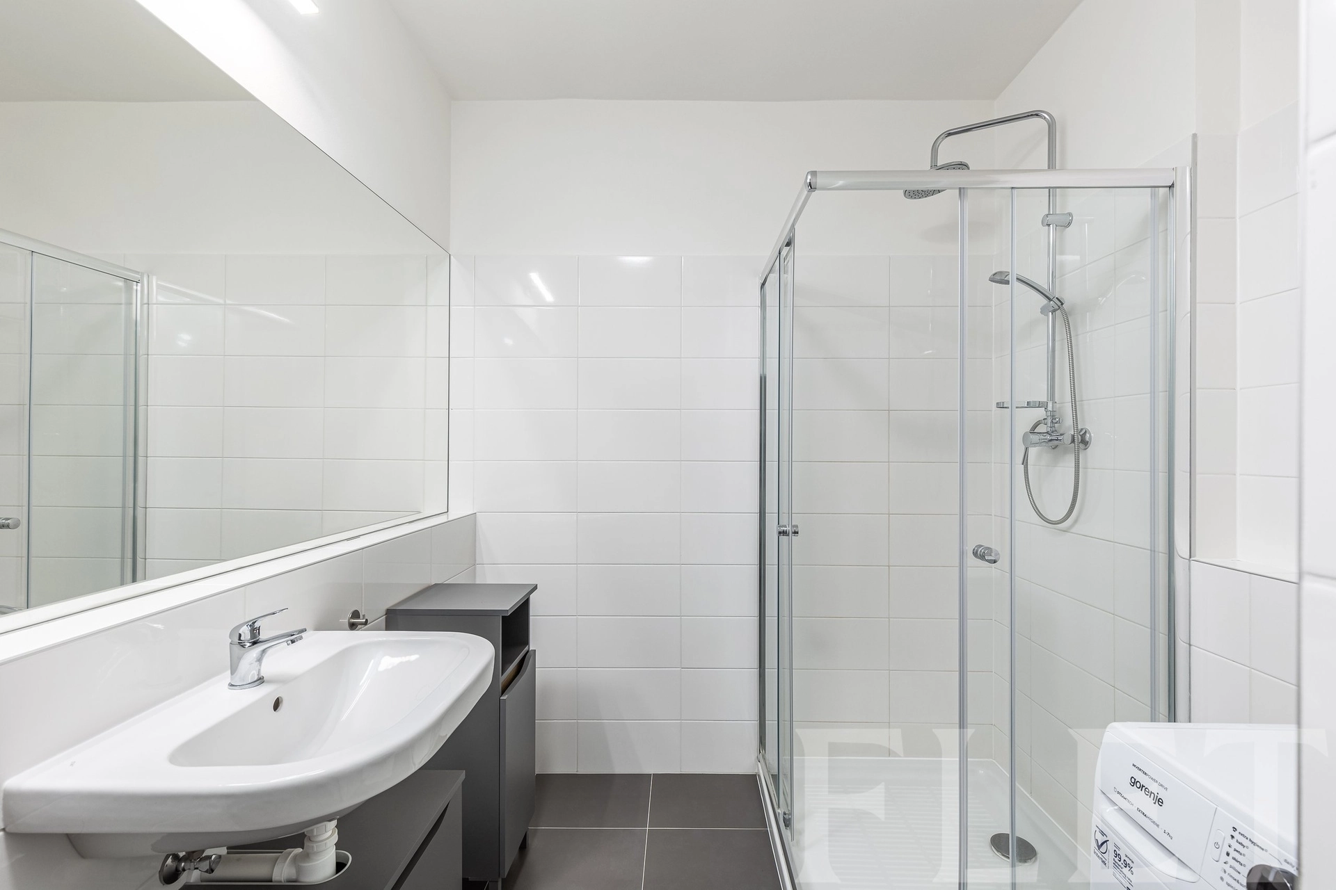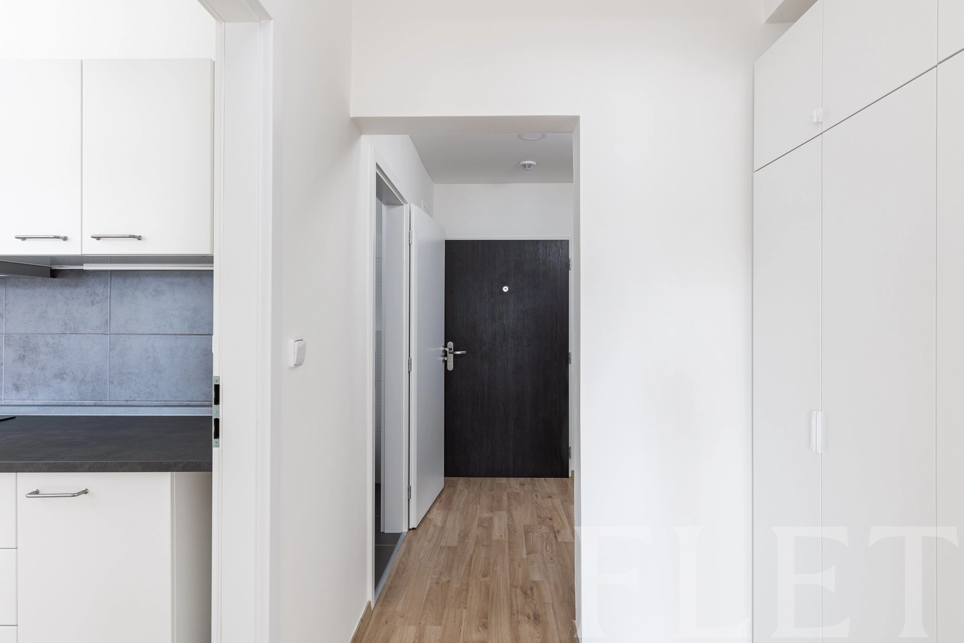 Dispozice bytu je velmi praktická a promyšlená. Ze vstupní chodby s vestavěnými skříněmi se dostanete do všech místností. Koupelna je vybavena sprchovým koutem a toaletou v moderním, nadčasovém standardu. Samostatná ložnice nabízí dostatek prostoru pro plnohodnotnou postel i úložné řešení. Hlavní obytná část je tvořena světlým obývacím pokojem propojeným s kuchyňským koutem a jídelním prostorem. Kuchyňská linka je v čistém designu, doplněná o vestavěnou troubu, varnou desku, myčku, digestoř i lednici. Velká okna zajišťují dostatek denního světla a příjemnou atmosféru. Celkově byt působí velmi vzdušně, čistě a je připraven k okamžitému užívání.