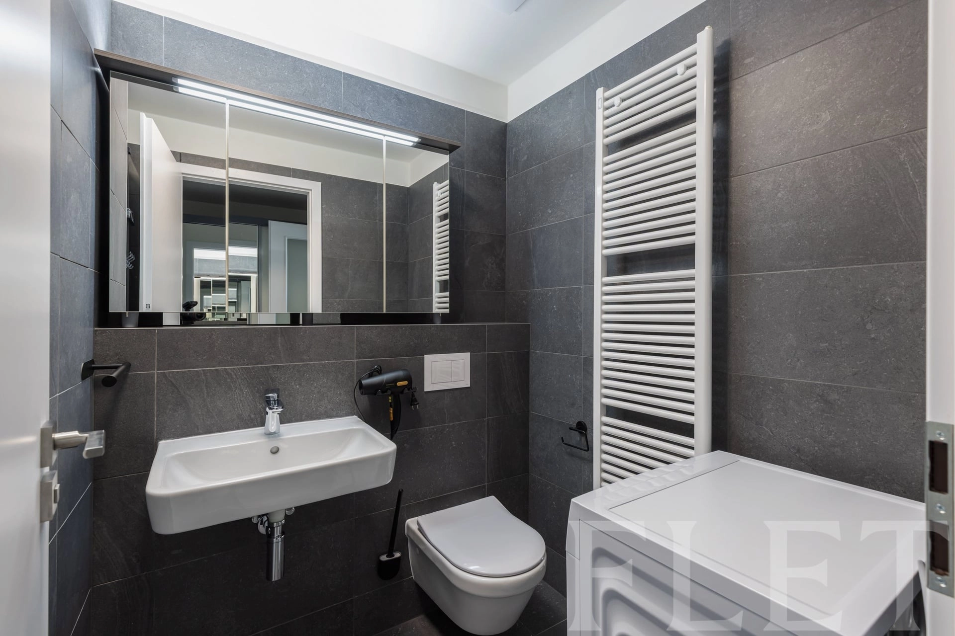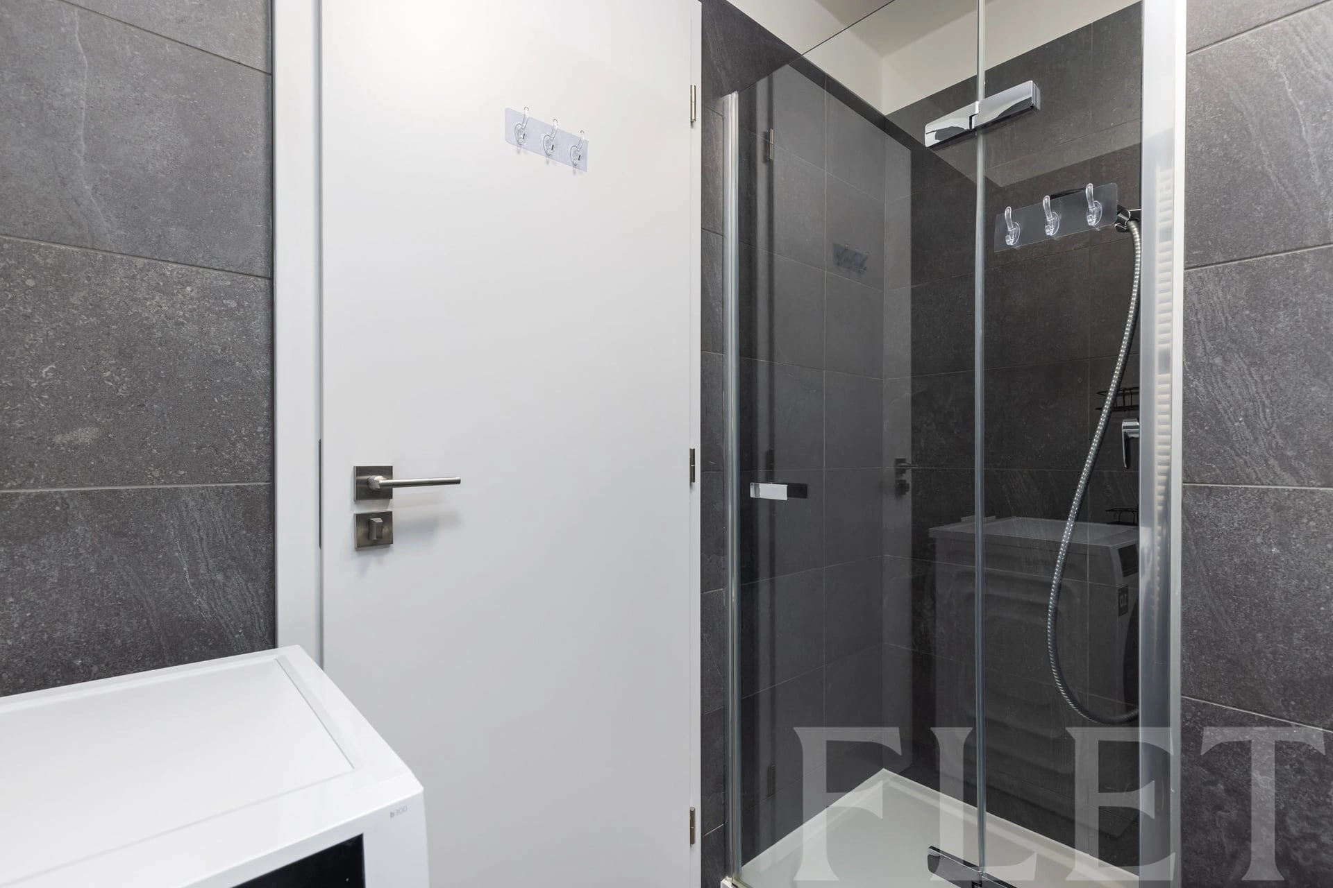 Byt je vybaven moderní kuchyňskou linkou se spotřebiči – varnou deskou, troubou, digestoří a myčkou nádobí. V koupelně se nachází sprchový kout, toaleta a dostatek místa pro pračku. Součástí vybavení je také klimatizace, která zajišťuje komfort i v letních měsících.