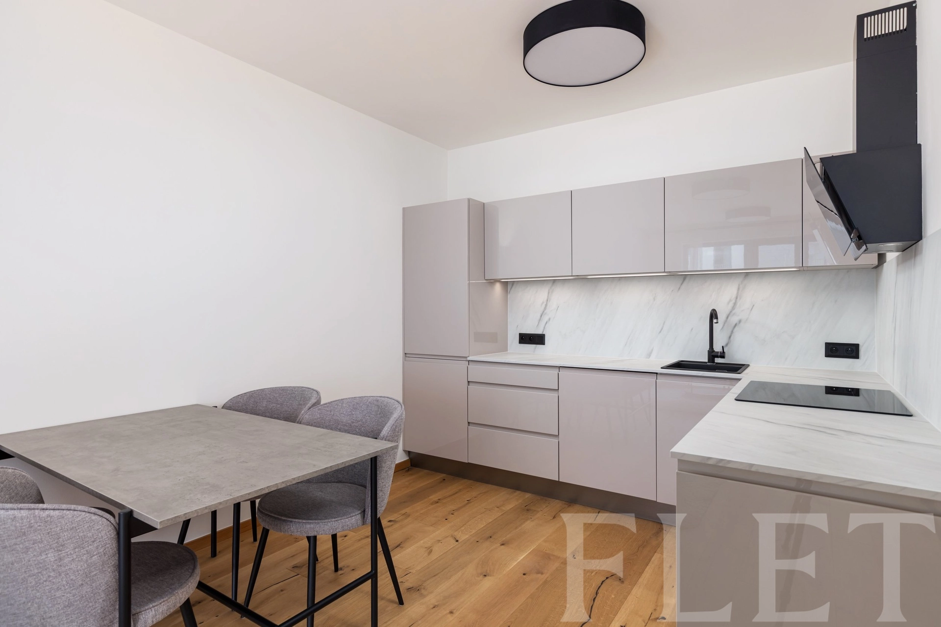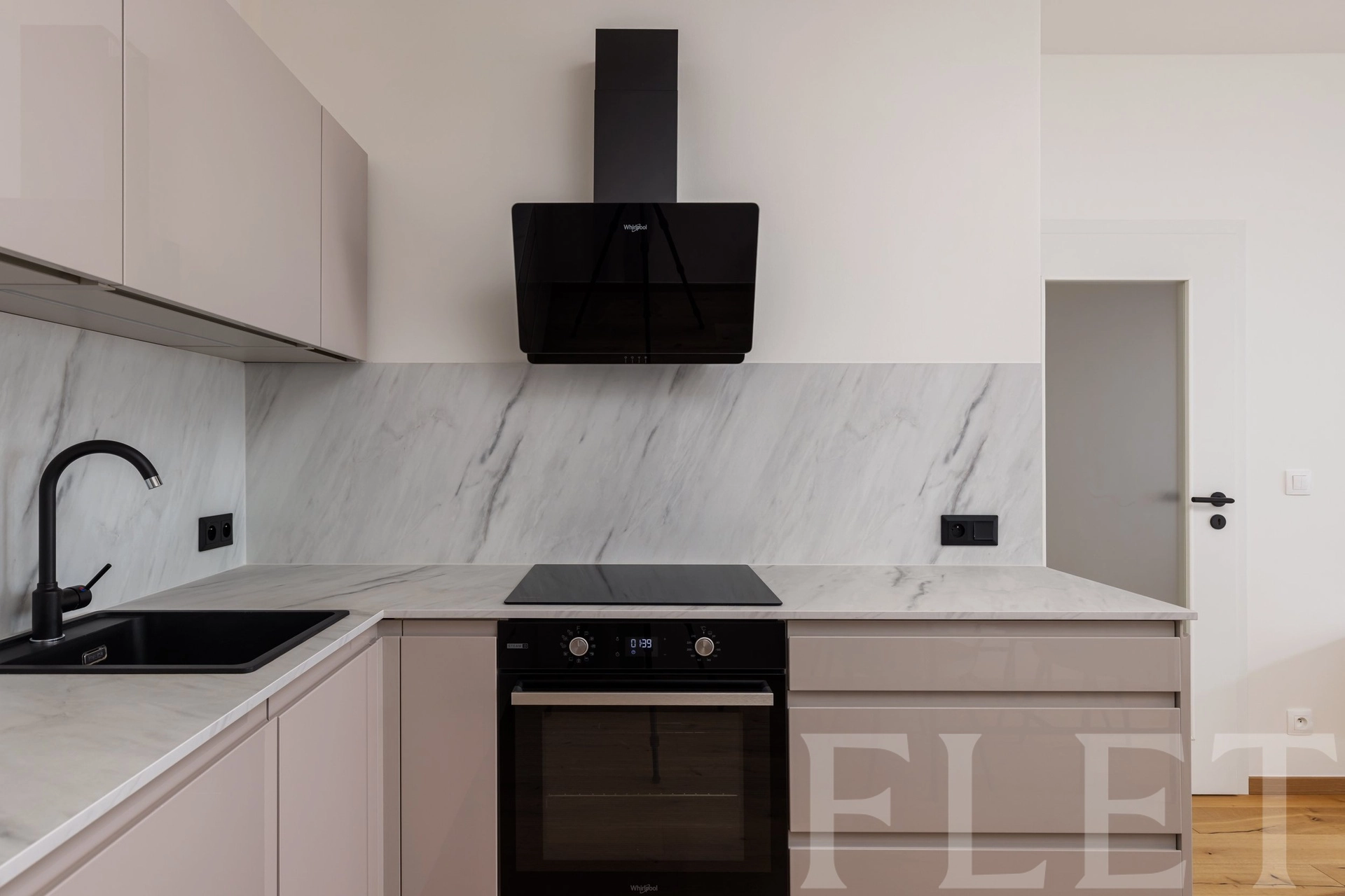 Moderní kuchyňská linka značky Sýkora disponuje všemi potřebnými spotřebiči – varnou deskou, troubou, digestoří, myčkou i lednicí. V celém bytě jsou instalovány předokenní rolety, které zajišťují soukromí i tepelný komfort.