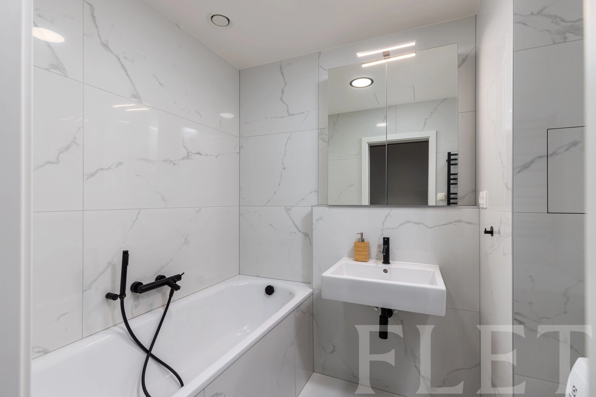 Koupelna je vybavena vanou a pračkou, toaleta je samostatná. Součástí bytu je také samostatná šatna s vestavěnými skříněmi, která nabízí nadstandardní úložný prostor. V předsíni je navíc další vestavěná skříň. Komfort každodenního bydlení dále zvyšuje sklep a garážové stání přímo v domě.
