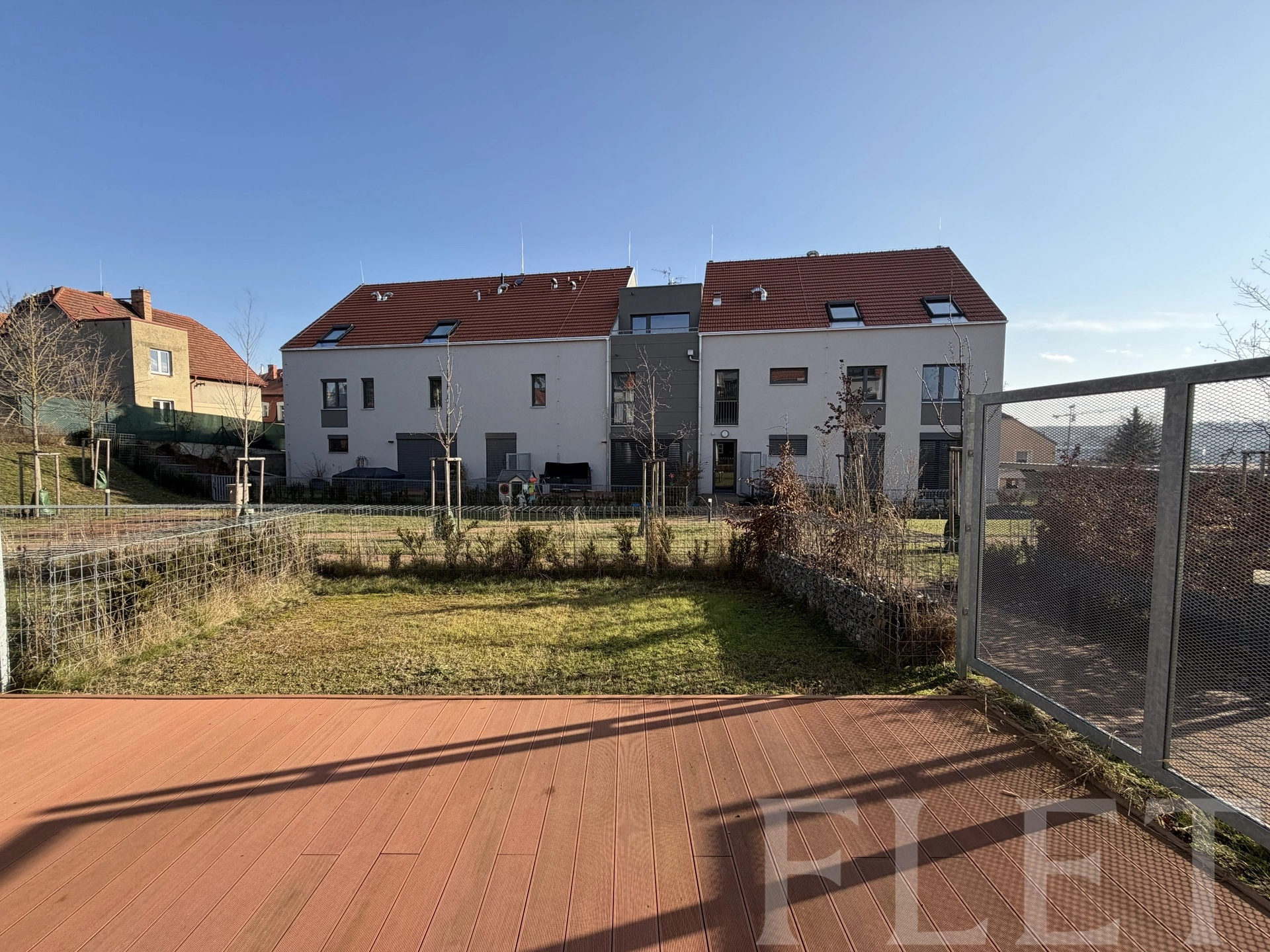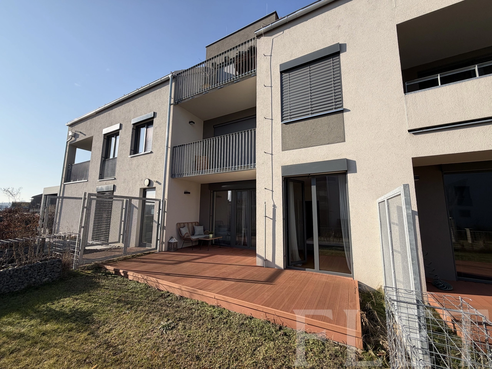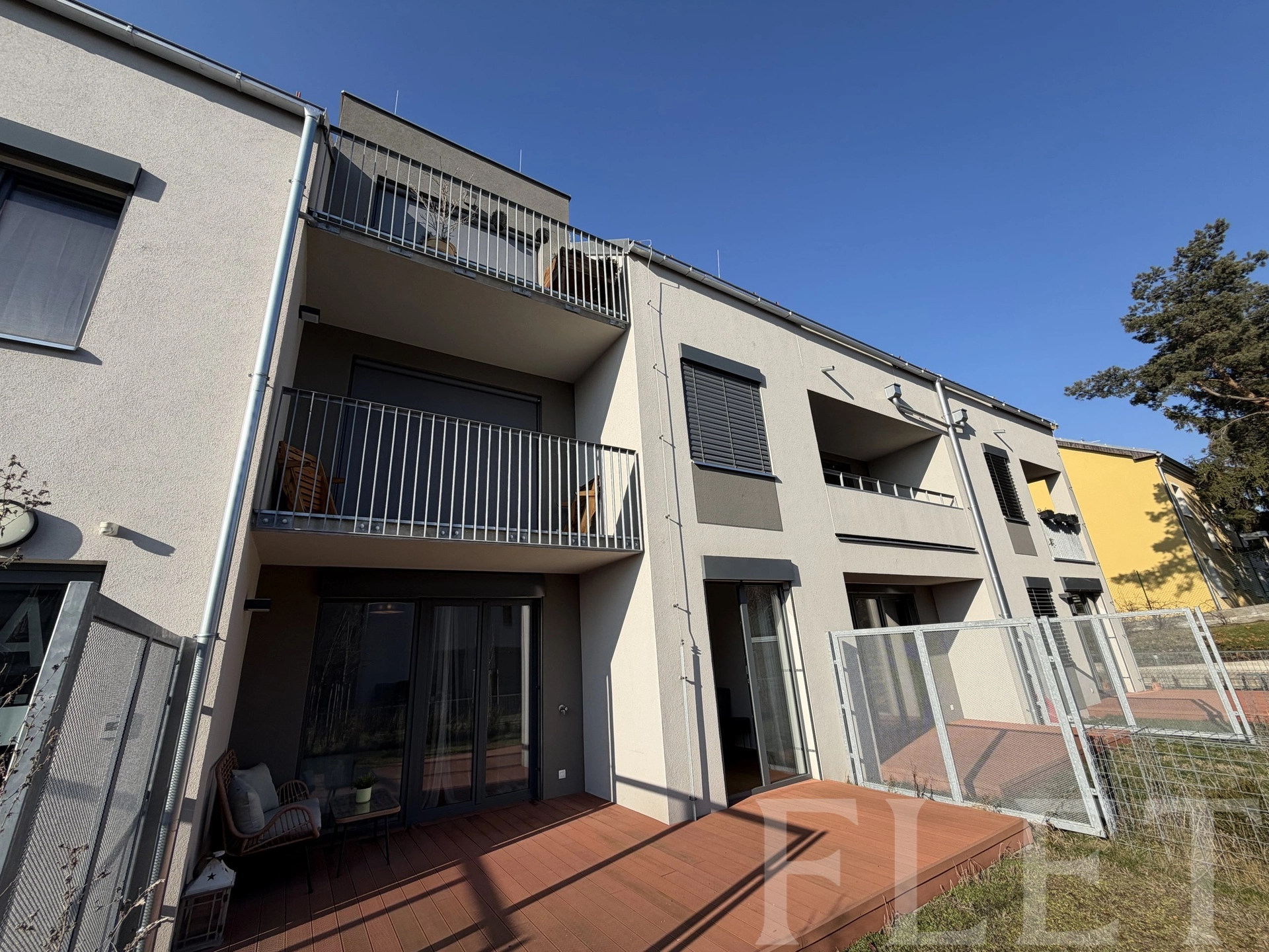 Velkým benefitem je soukromá zahrádka o velikosti 48 m², orientovaná na jih do klidného, soukromého vnitrobloku. Díky dřevěné terase nabízí ideální prostor pro relaxaci, posezení s přáteli i klidné chvíle po práci. K bytu navíc náleží také soukromá terasa v posledním patře domu, odkud si můžete vychutnat příjemné výhledy do okolí.