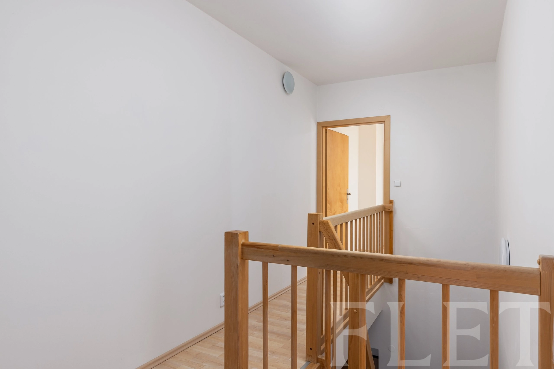 Po schodišti z předsíně vystoupáte do druhého podlaží, kde najdete dva další pokoje. Ty lze využít jako ložnici, dětský pokoj nebo pracovnu. Z jednoho pokoje je vstup na balkon s příjemným výhledem, druhý je vybaven šatní skříní a psacím stolem. Dále se zde nachází koupelna s prostornou vanou a toaletou. Praktická komora s pračkou navíc poskytuje vítaný úložný prostor.